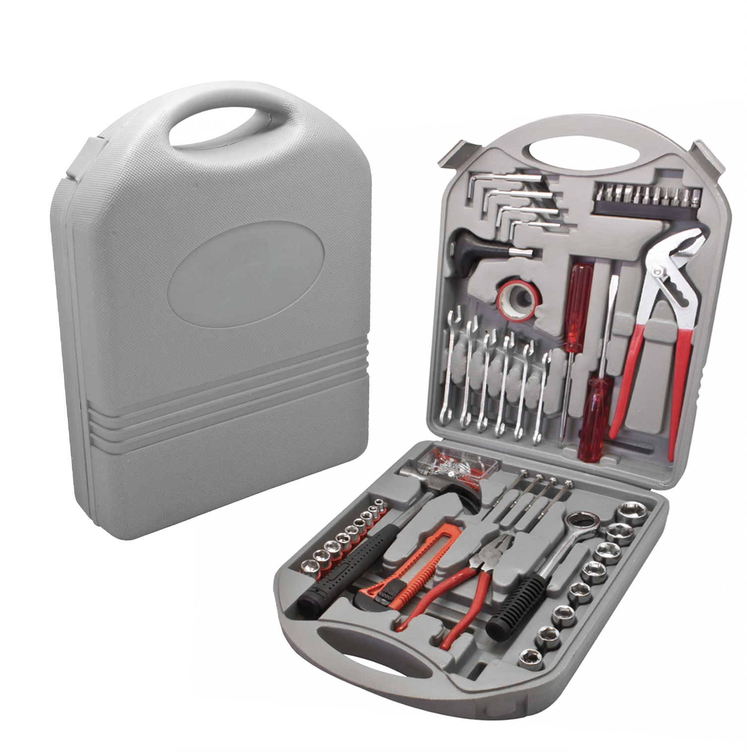 Tool set includes a claw hammer, adjustable pliers, linesman pliers, 6 combination wrenches, 4 precision screwdrivers, 4 allen wrenches, ratchet driver, 11 ratchet driver bits, ratchet driver bit holder, socket wrench, 17 sockets, socket holder, flat-head screwdriver, phillips screwdriver, utility knife, PVC tape, 90 assorted fasteners, and a durable carrying case. All tools are in SAE measurements.