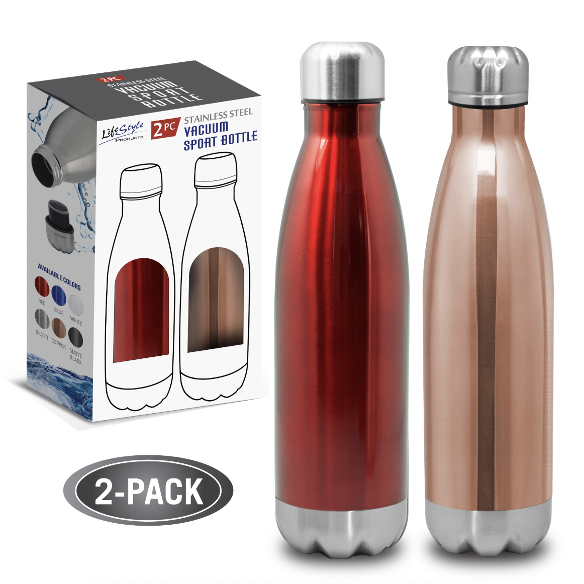 2 pack, 17 oz stainless steel sports vacuum bottles. Great for hot or cold liquids. Double wall stainless steel construction. Screw on/off lid. Reusable. Odor free. BPA free and Eco-friendly.