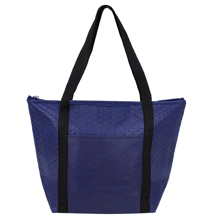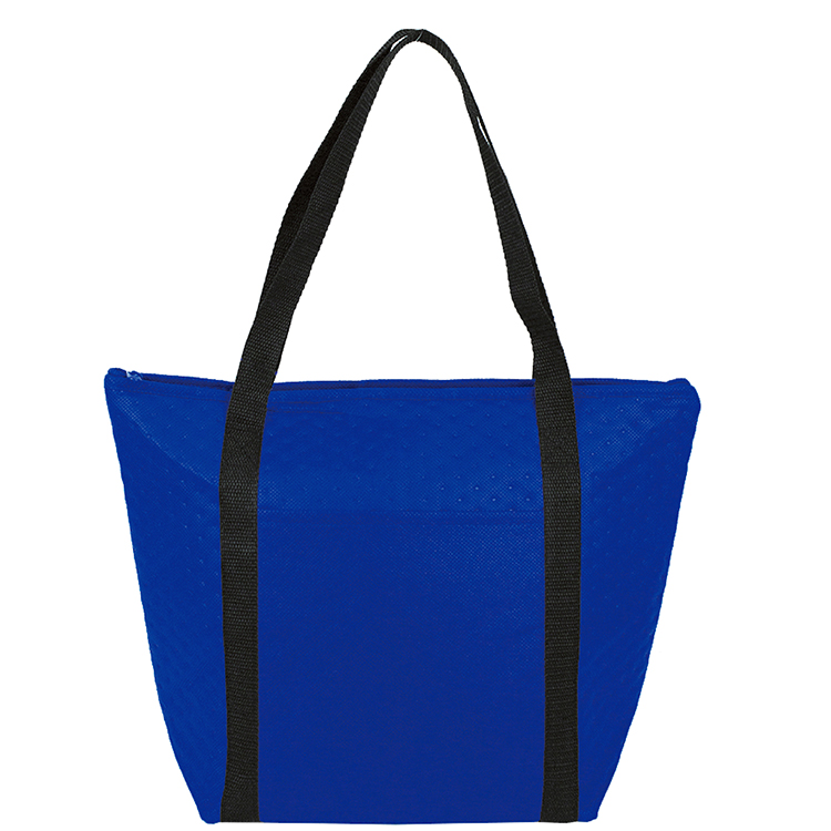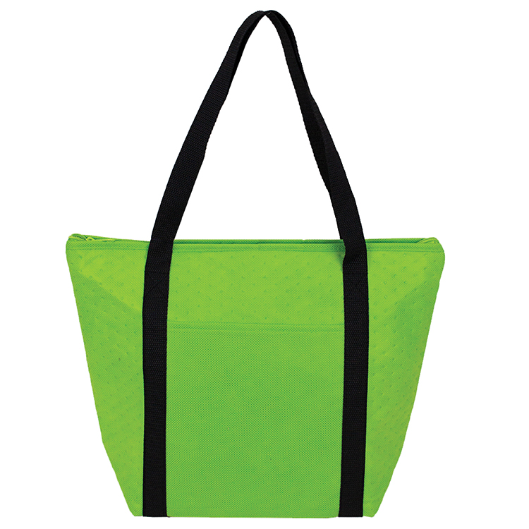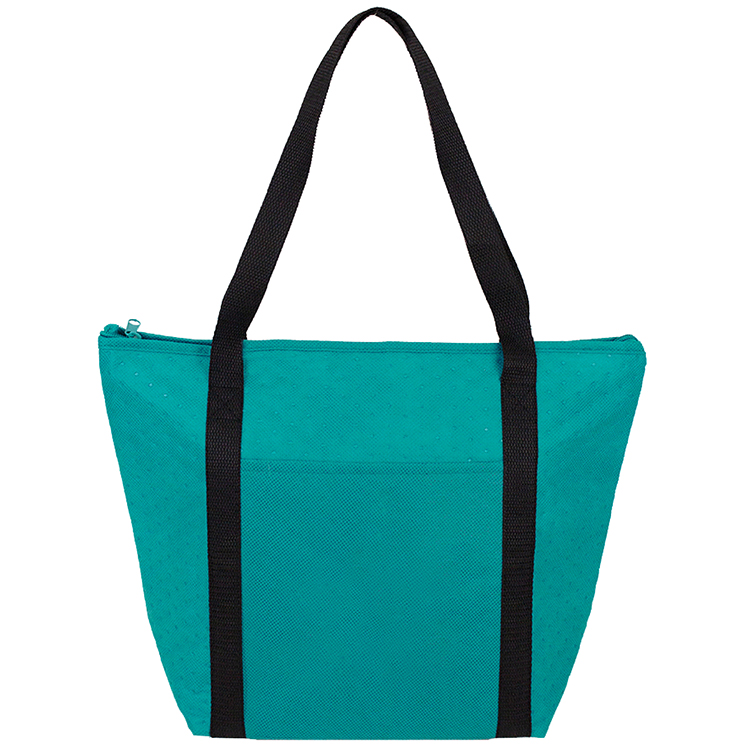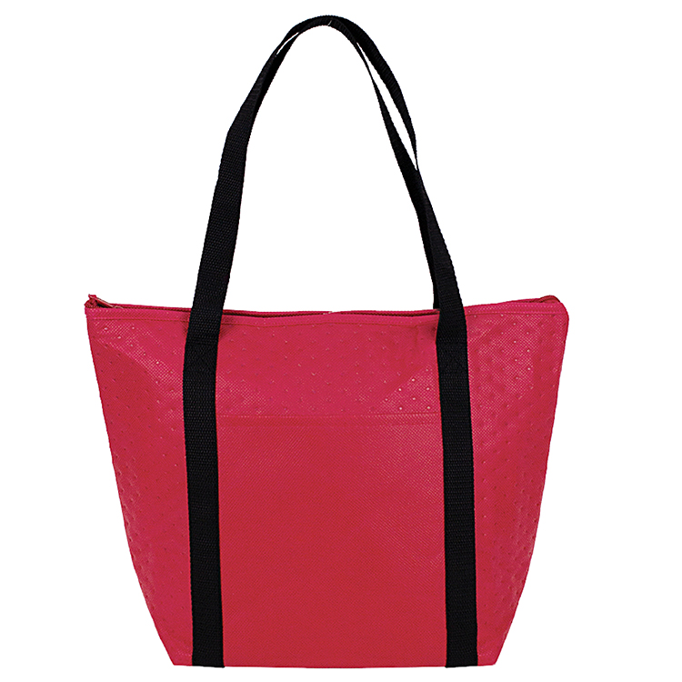 Hot/cold cooler tote features foil lined interior to keep food insulated.