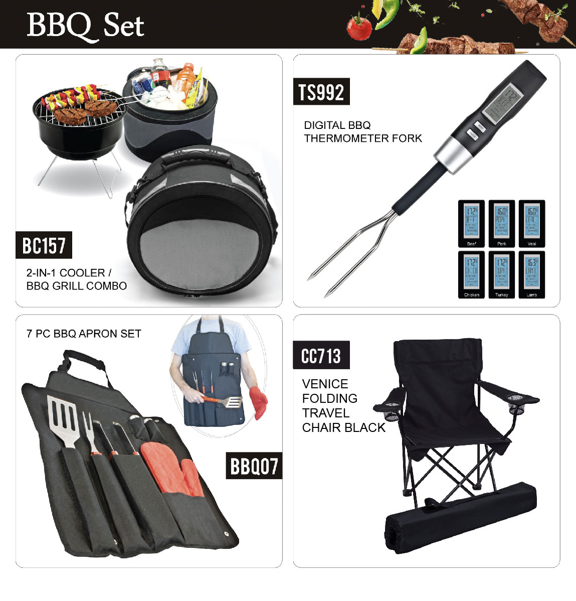 Tags: 2in1 cooler and bbq grill, BBQ, blank goods, chef barbecue apron set, collapsible cooler, cooler backpack chair, outdoor essentials, picnic essentials