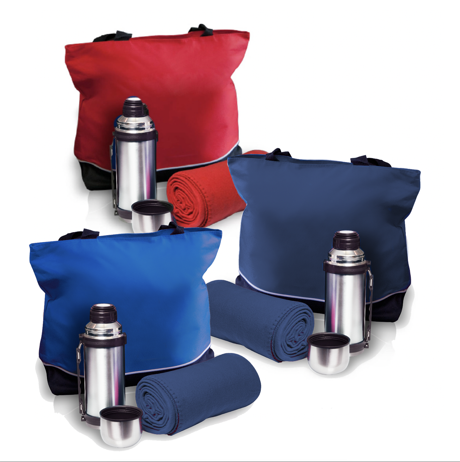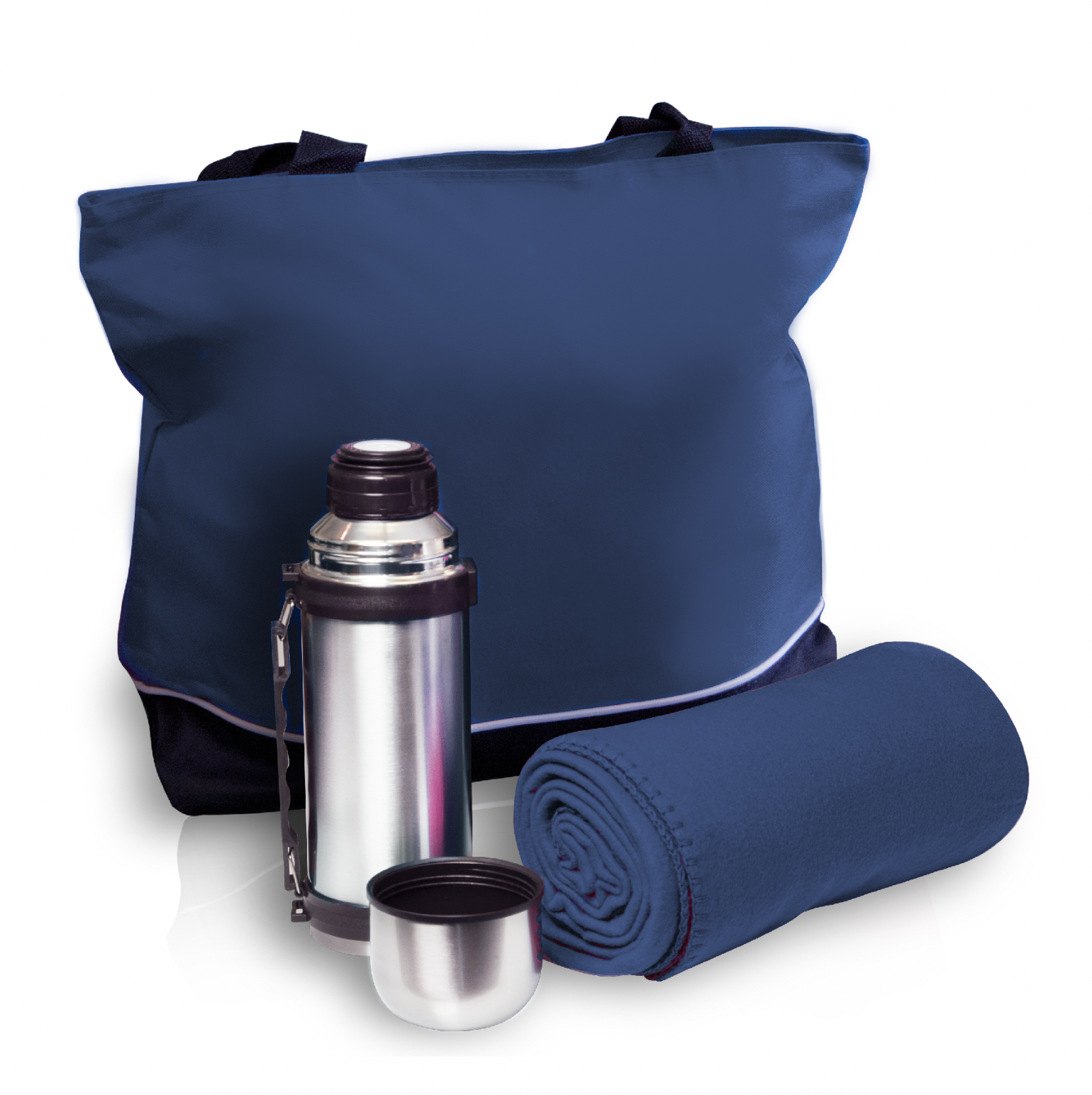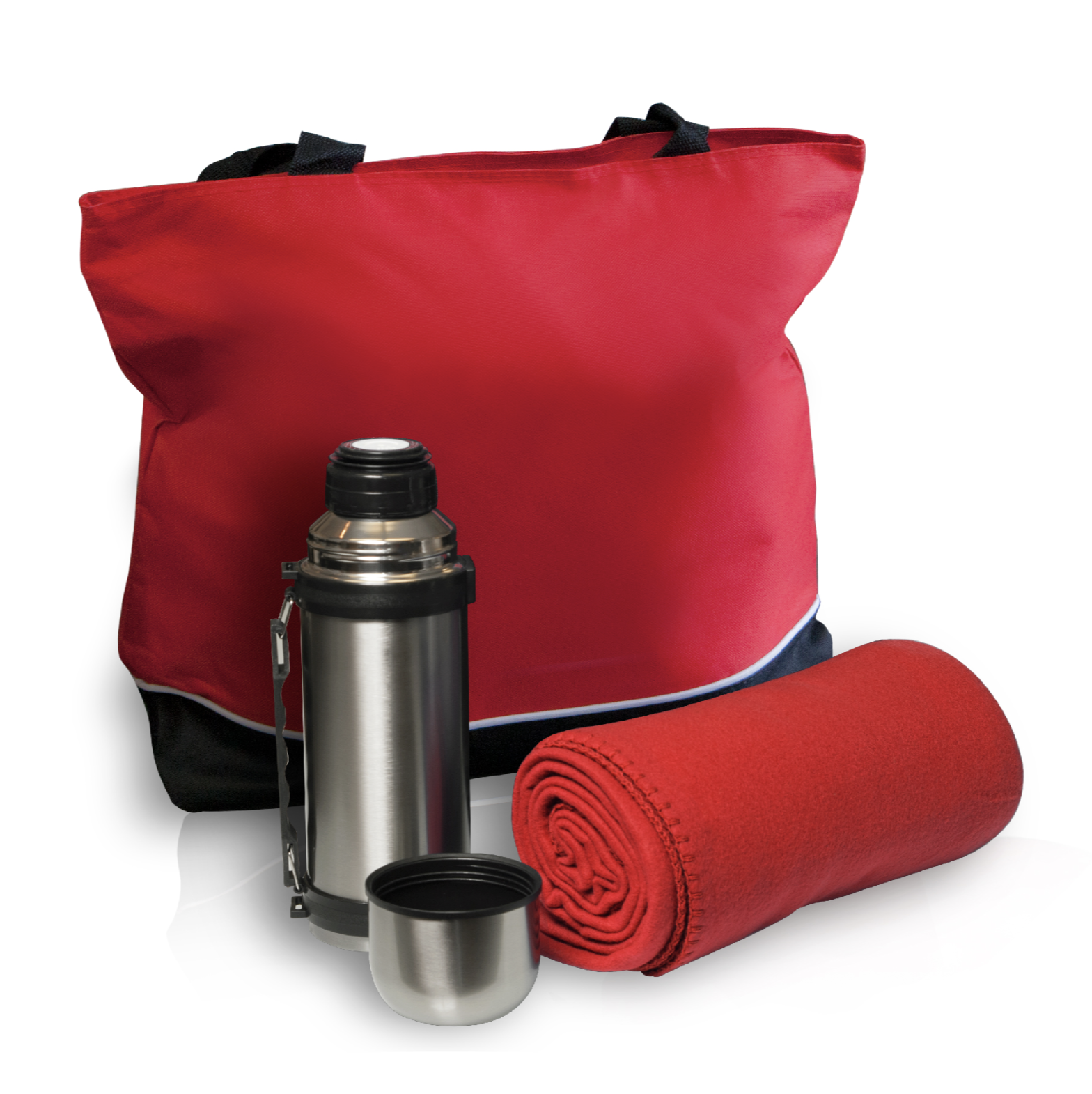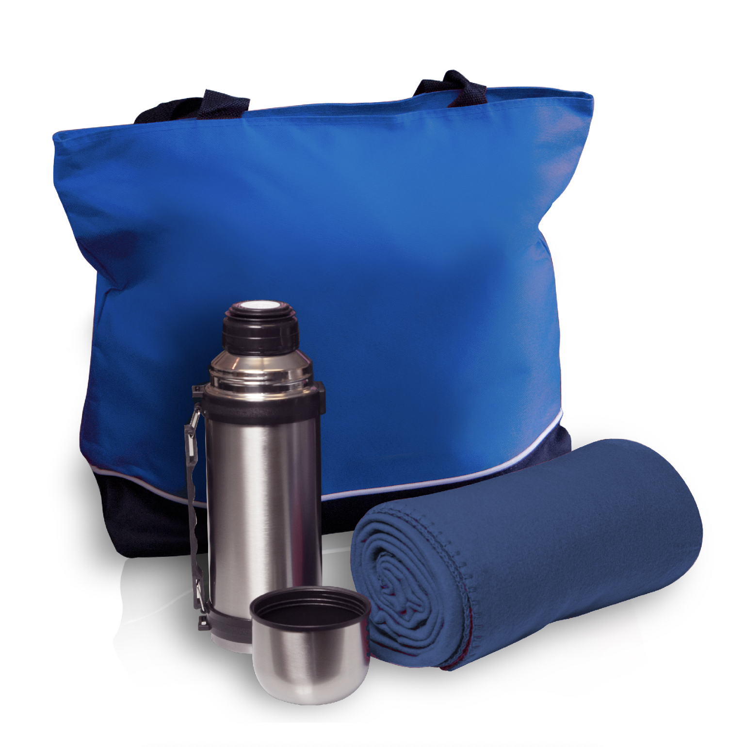 Travel tote set includes a large 600D poly with PVC backing travel tote with zippered closure and 29″ shoulder straps, plush 200 gsm polar fleece blanket and a 1-Liter travel vacuum bottle with lid/cup (33.5 oz.). Great for the beach, park, picnics, games, outdoor and sporting events, camping, hiking and tailgating.