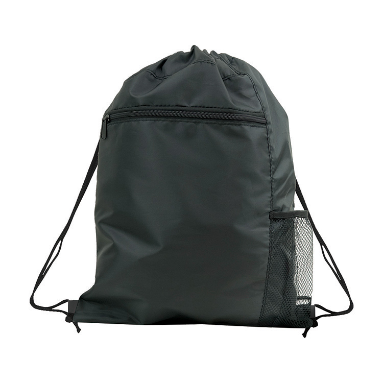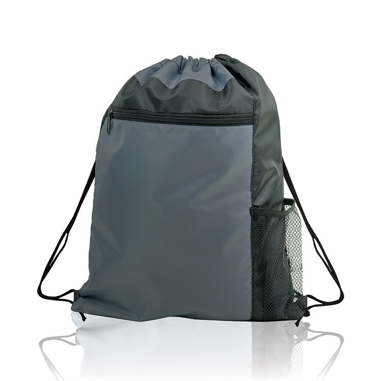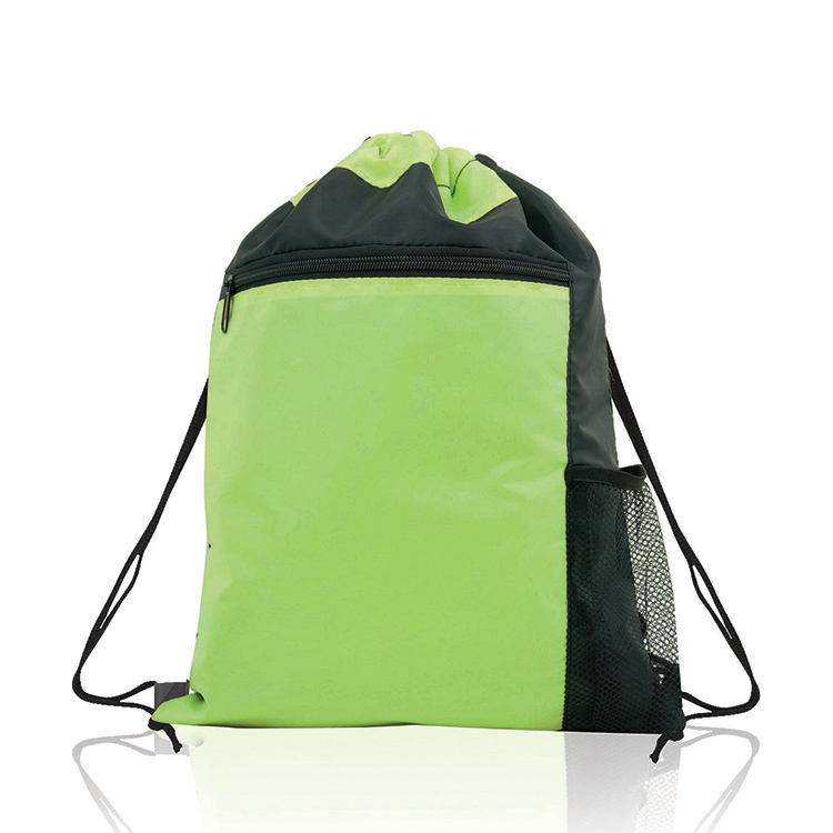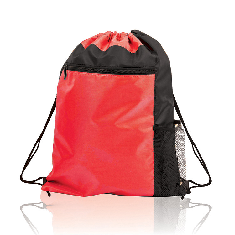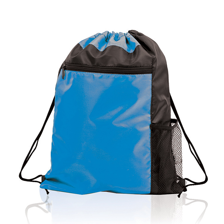 210 Denier Drawstring bag with colored front pocket & Side Mesh Pocket.