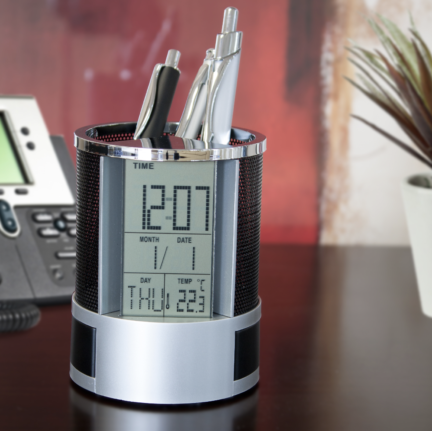 Features digital calendar, alarm clock, thermometer, and 2 flip-open storage cabinets. Metal mesh caddy. Batteries included.