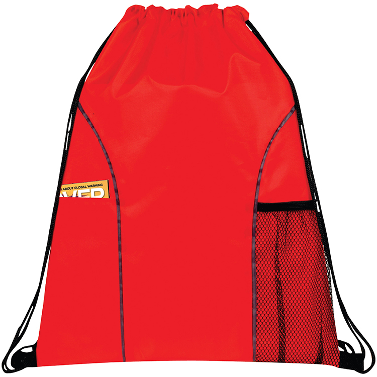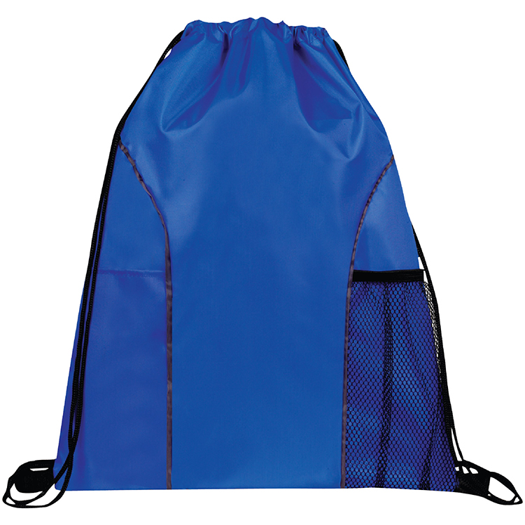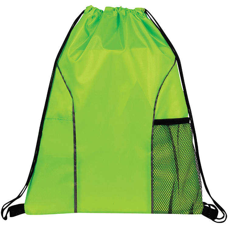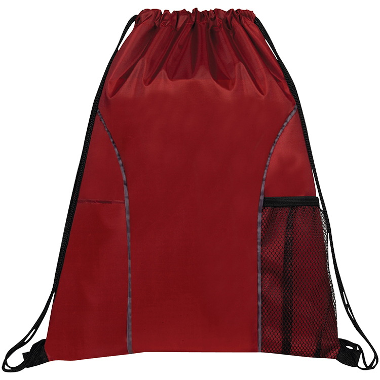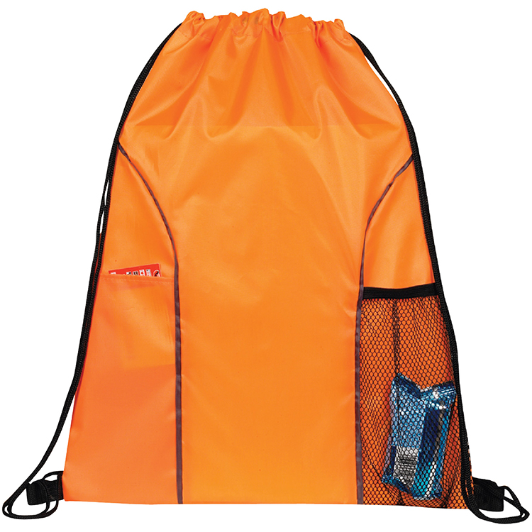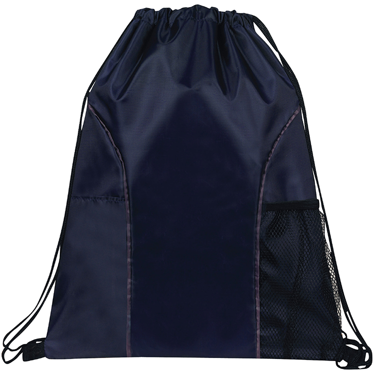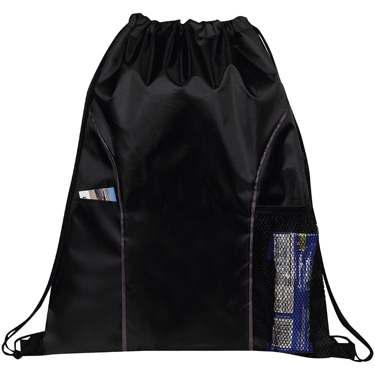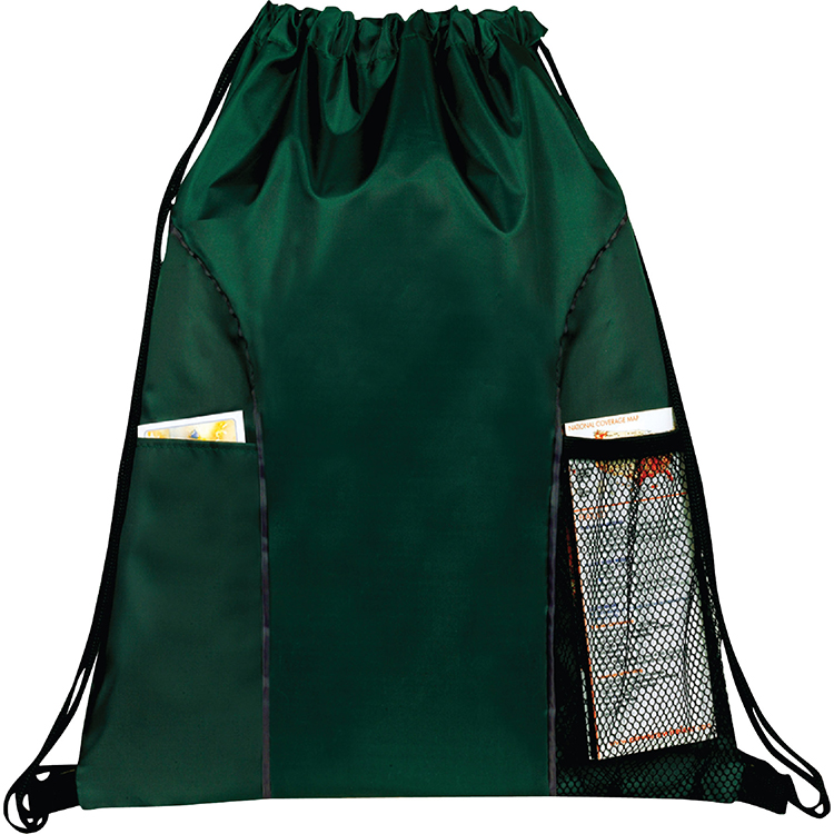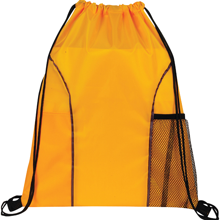 210 denier drawstring nylon backpack with dual front pockets. Features a mesh pocket & a solid slit pocket. 21″ Strap.