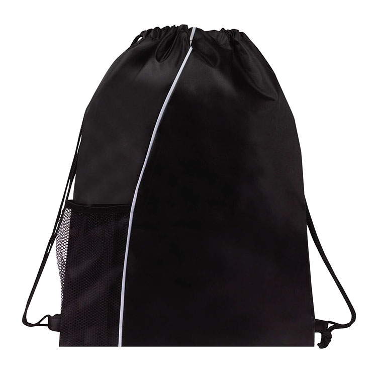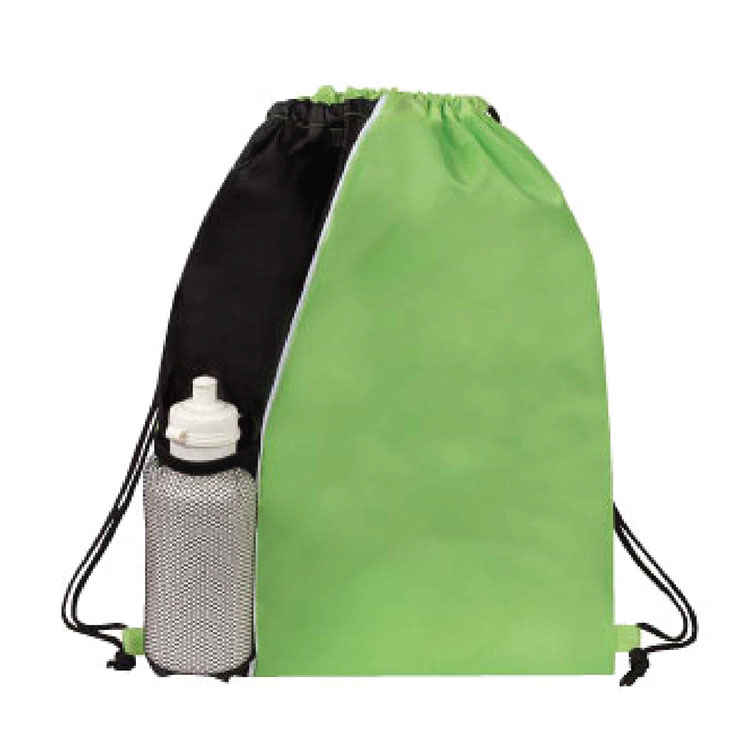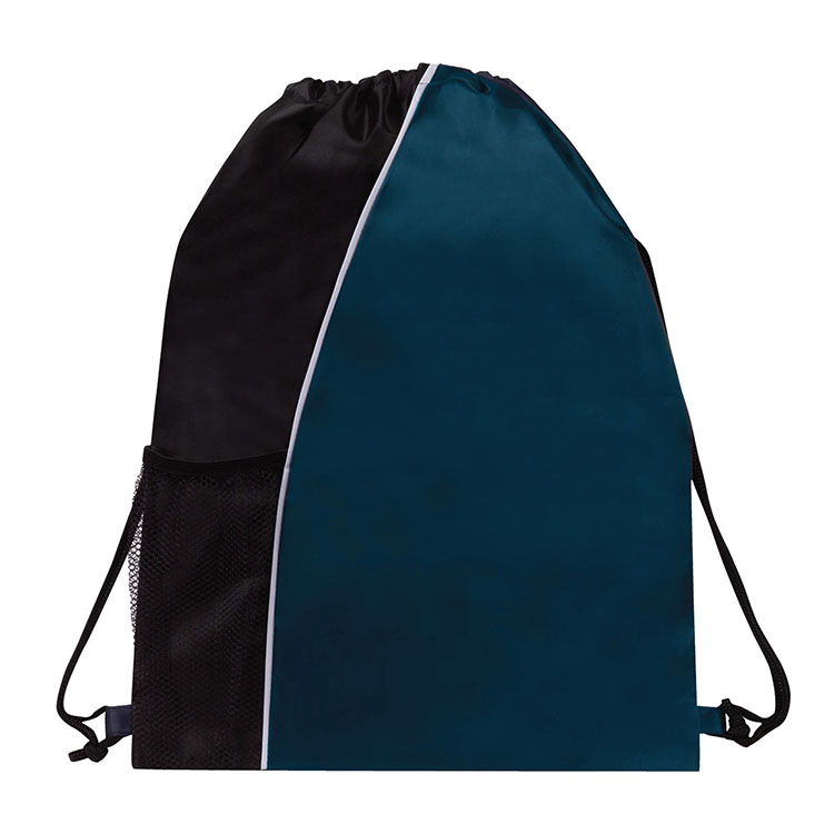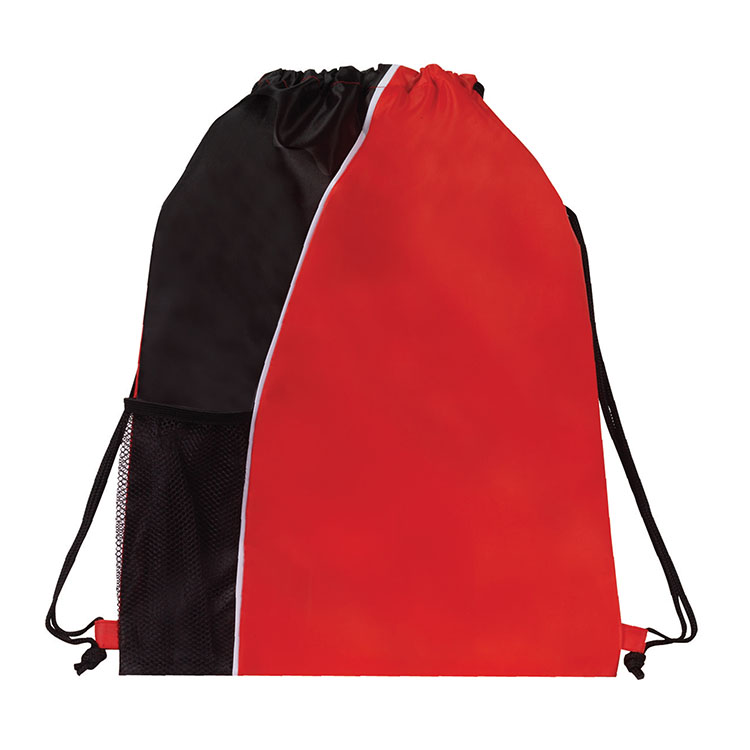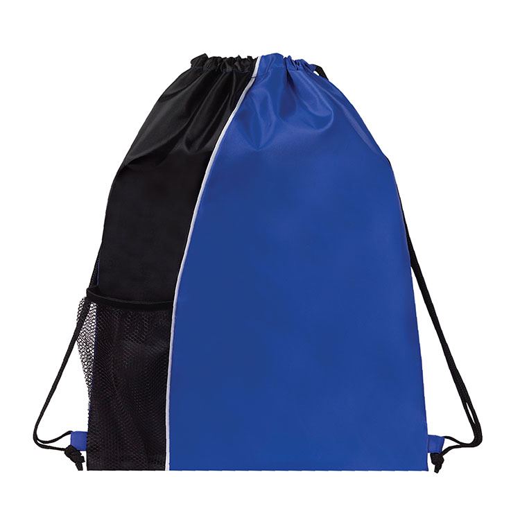 Duo-tone drawstring sports bag includes a front mesh pocket for sports bottle, accessories, or thermos. Made with 210D nylon. 20″ Strap.