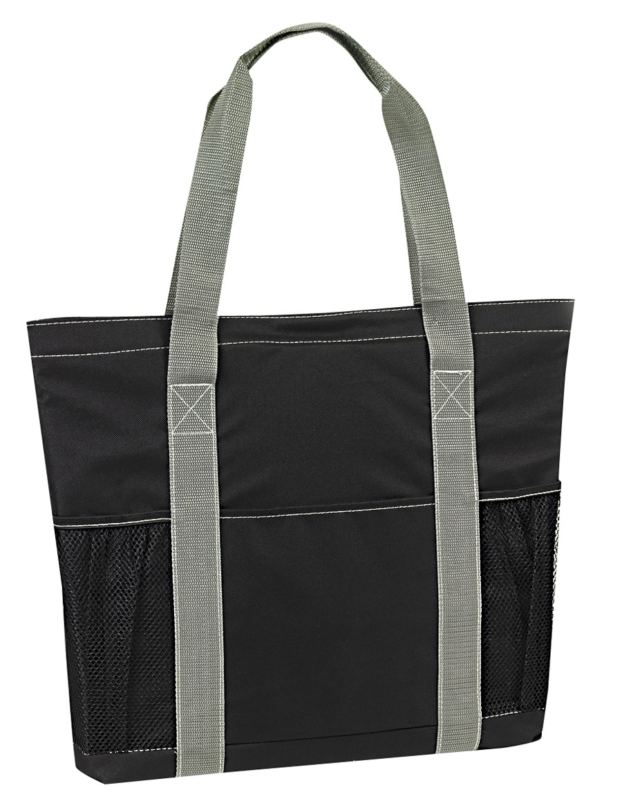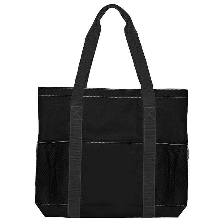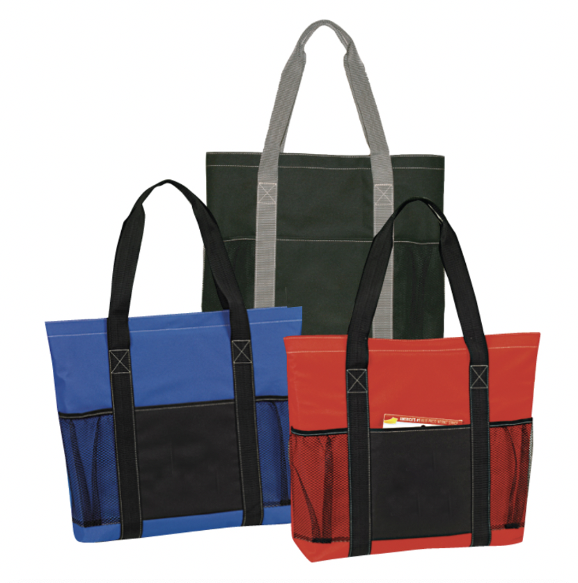 600D polyester with PVC backing. Two side mesh pockets, front slip pocket, and velcro top closure. Has 24″ Straps.