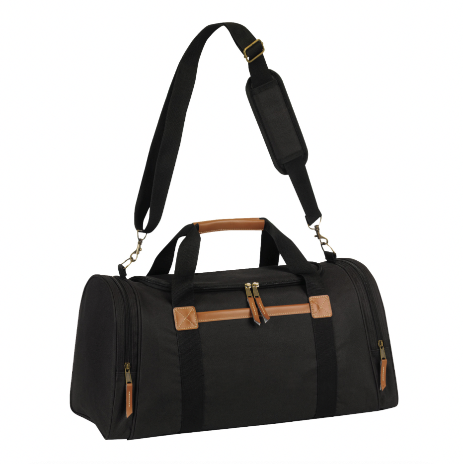 This duffel bag is made of 600D Polyester with leatherette trim. It features a u-shaped large main compartment, two zippered end pockets, 29.5″ padded handle, and 36″ – 56.5″ adjustable, removable shoulder strap.