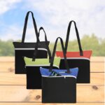 600D Large tote bag comes with two zippers on main compartment and contrasting side pocket. It features an outside pen loop on the 29″ shoulder strap. Available Colors: Red, Lime green, Royal Blue, Black