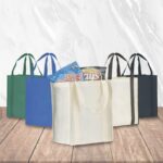 Large shopping tote with drop-in board. Made from eco-friendly, recyclable, non-woven polypropylene and 20″ handles.