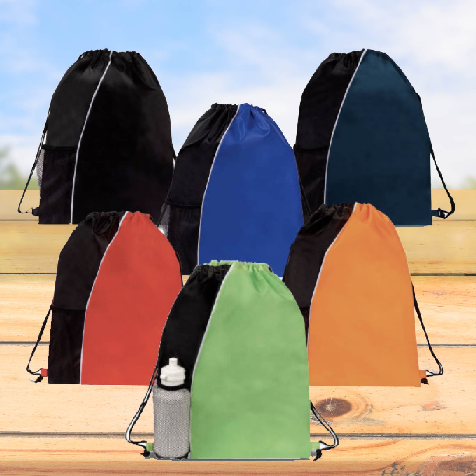 Duo-tone drawstring sports bag includes a front mesh pocket for sports bottle, accessories, or thermos. Made with 210D nylon. 20″ Strap.