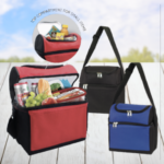 6-can, fully insulated, 600 denier cooler with PVC backing. Features dual compartments, back mesh pocket, and adjustable shoulder strap. With heat sealed moisture resistant insulated lining to prevent leaks. Available Colors: Black, Red, Blue